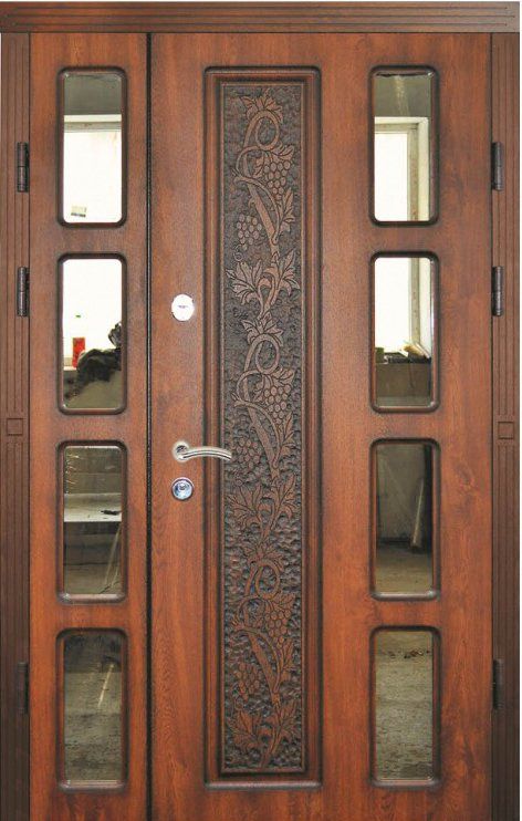 Поскольку в большинстве случаев устанавливаемые на входе в коттедж двустворчатые двери являются еще и предметом интерьера, украшающим здание, их дизайну предается особое значение. Эти двери, как правило, отделываются атмосферостойким МДФ, натуральным шпоном, массивом. Эффектно на таких дверях смотрится витражный узор, применение ковки, зеркальных элементов. Вариантов декора входной двустворчатой двери масса, тут все зависит от пожеланий заказчика.